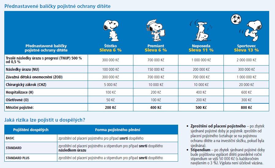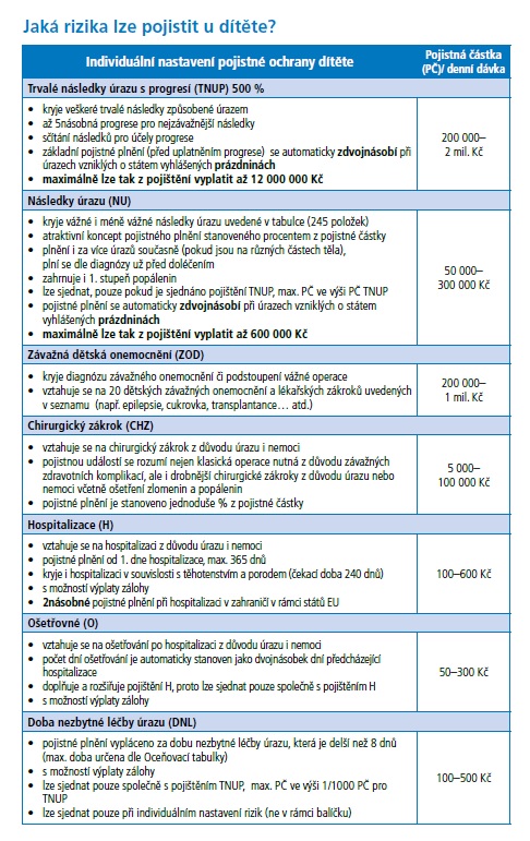 − riziková varianta (pojištění úrazu a/nebo nemoci dítěte a volitelně pojištění dospělých)