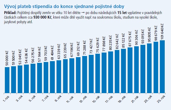 - Připojištění rodiče např. v balíčku Standard - Stipendium - ročně dítě získá 50 000 Kč s navyšováním o 3% při smrti rodiče! Zproštění od placení pojistky až do 25 věku dítěte